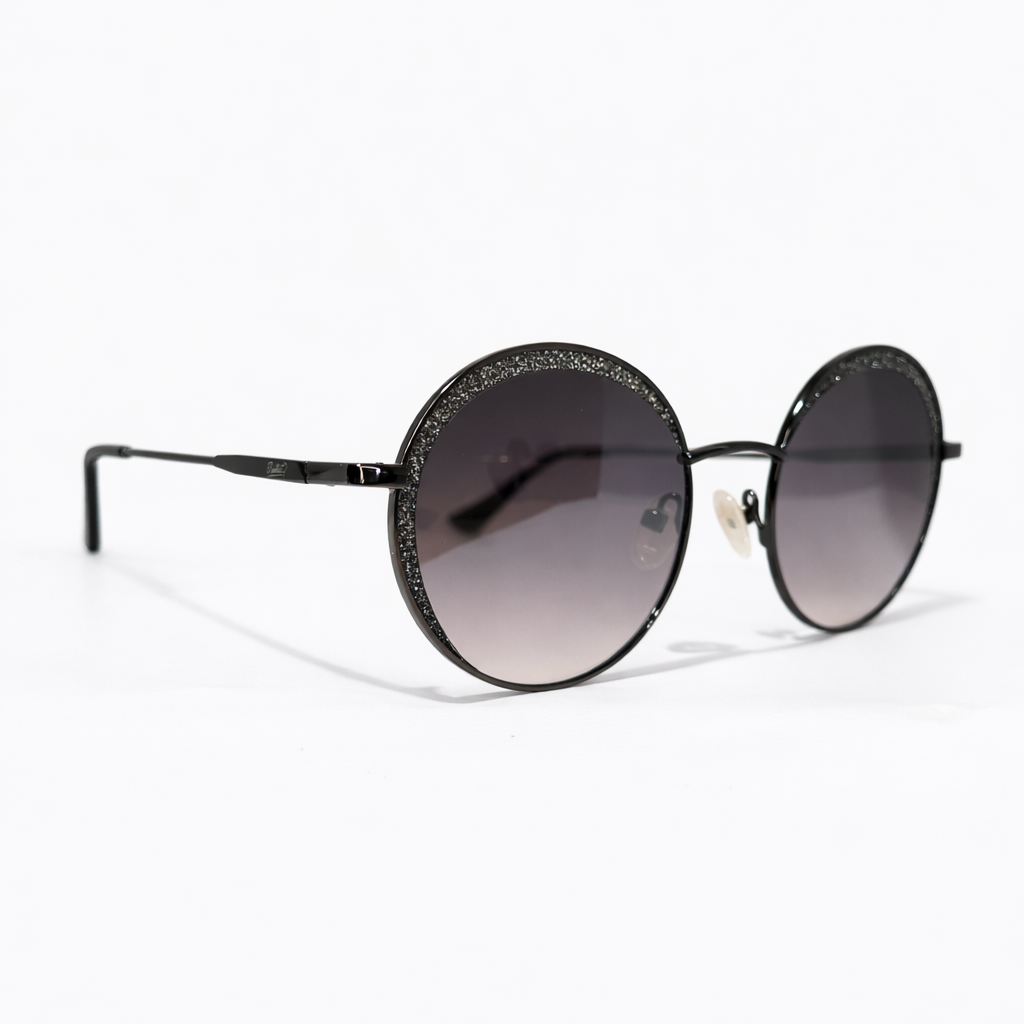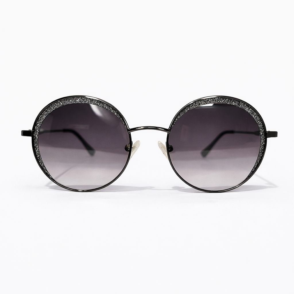 Un clásico con personalidad propia. La forma redonda aporta suavidad al rostro mientras que el armazón metálico negro mantiene una estética fina y elegante. El detalle protagonista está en el contorno: un delicado aro con brillo que enmarca la lente y genera un efecto sofisticado sin exagerar.